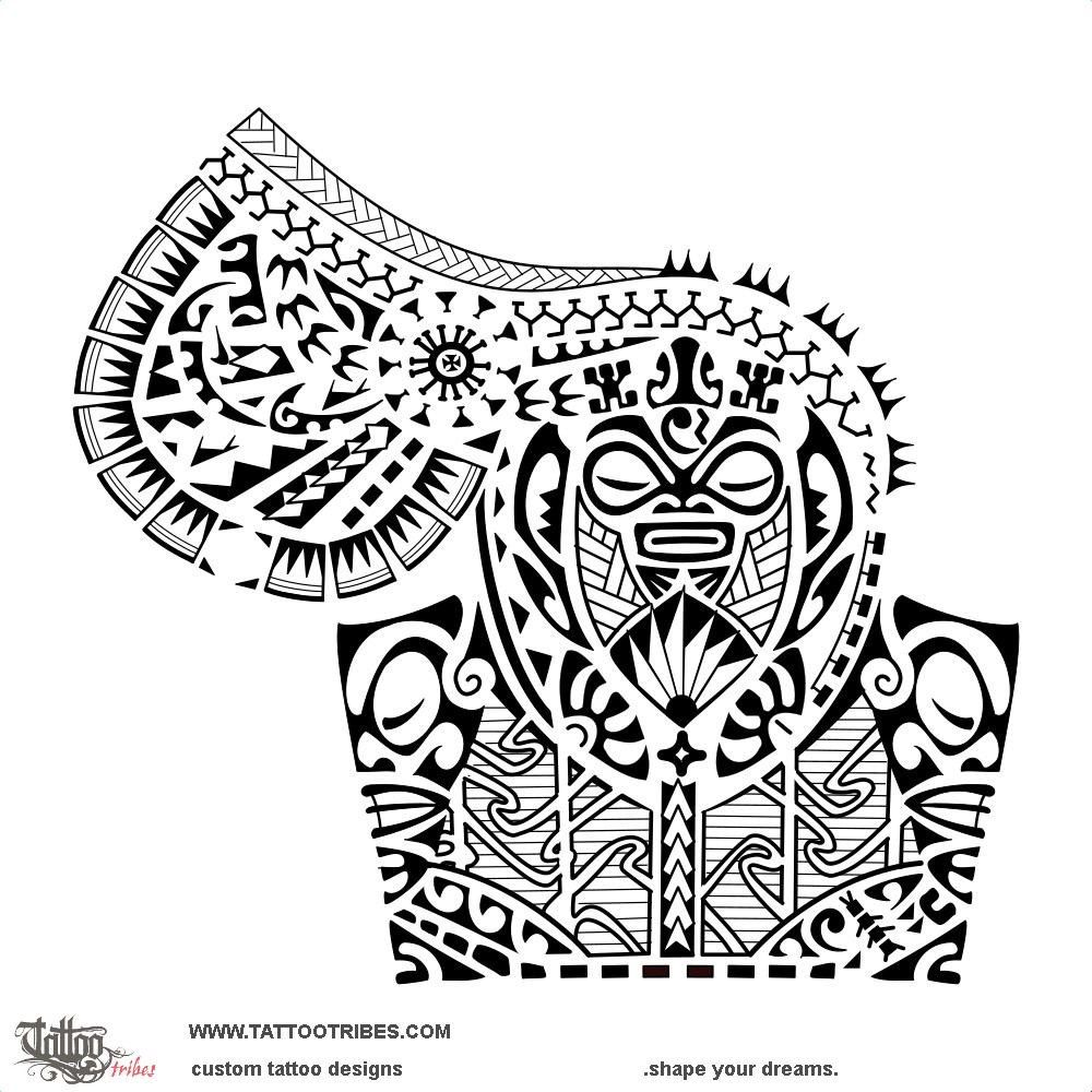 This Polynesian half sleeve and pec tattoo was prepared for Domingos and it includes a turtle centrally on the shoulder with flax leaves and braids to symbolize the importance of family.