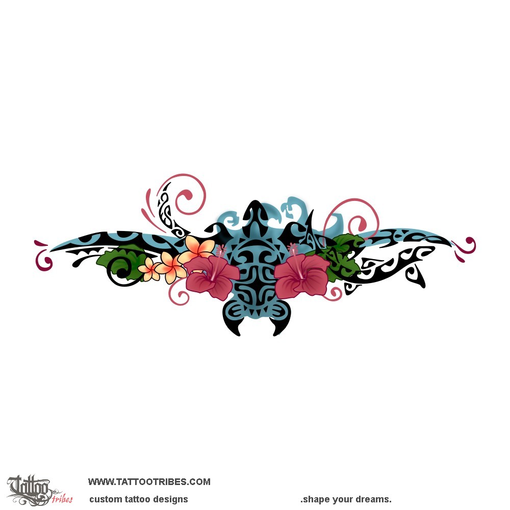 This backpiece tattoo with Polynesian influences and realistic color parts was prepared for Ellen to cover an old tribal design she had on her lower back.
