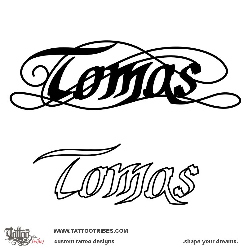 This tattoo was prepared for Alfonso, and it is the name of his son, Tomas, designed in chicano style writing, with one version enriched by the swirls typical of this style, and the second one simpler with no decorations.