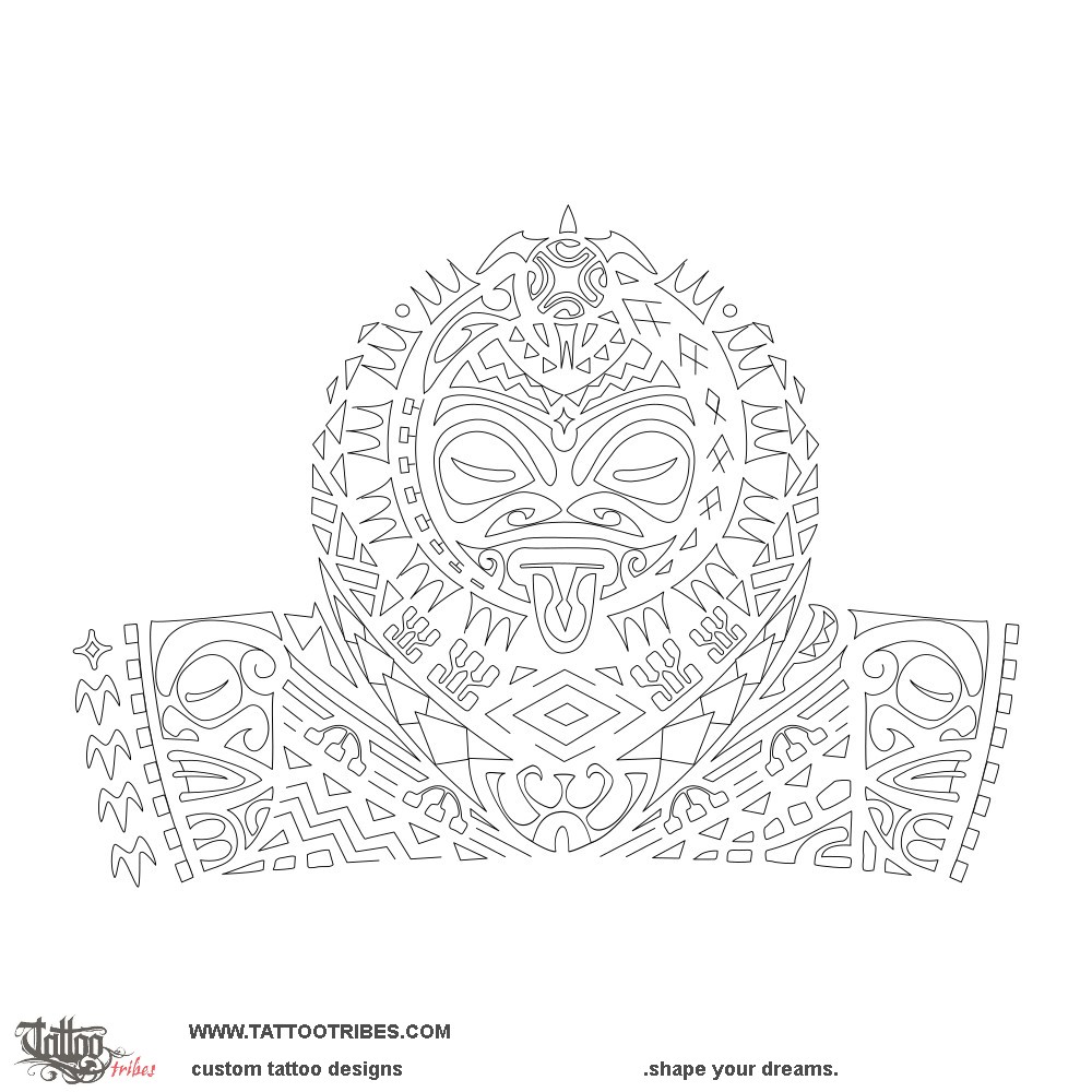 A tiki with outstretched tongue surrounded by a sun made of mountains is at the center of the shoulder, while two tiki on the sides protect his journey (the row of birds) toward his goal (the star).