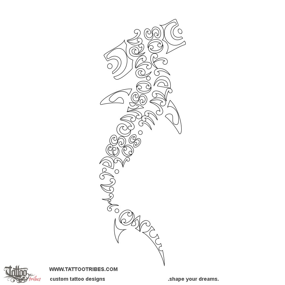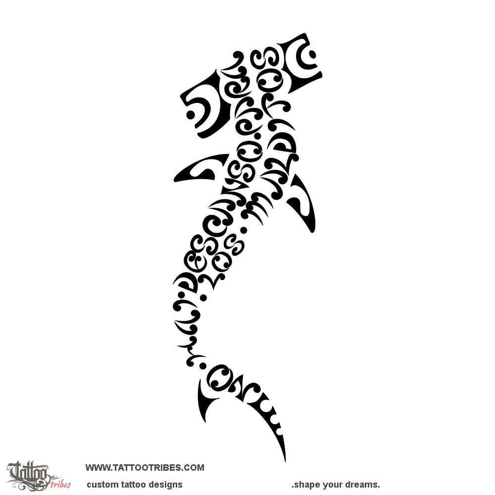 Polynesian tattoos explainedWe prepared for Alberto this hammerhead shark tattoo entirely made of maorigrams (letters shaped using two Polynesian symbols: koru and tiki eye) that spell the phrase "No hay descanso para los malditos" (Ain't no rest for the wicked).