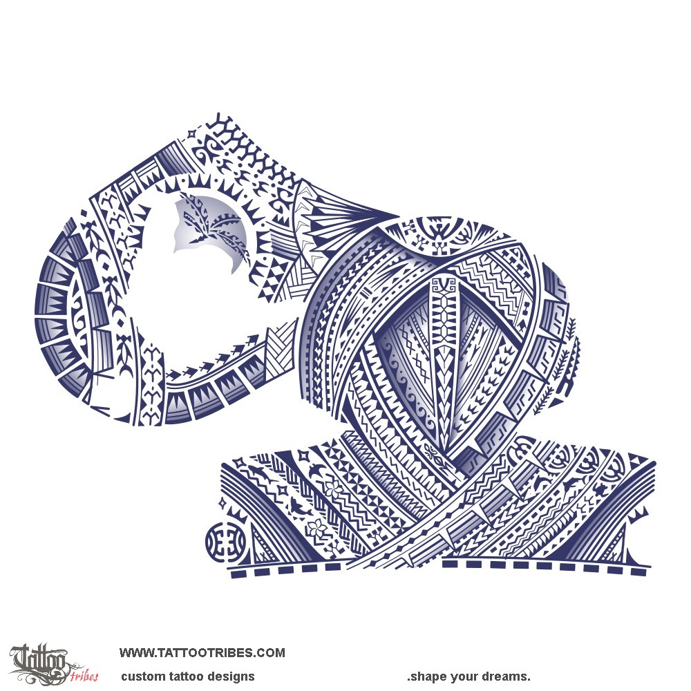 This Polynesian half sleeve and pec tattoo was designed for Hloud in navy blue to integrate a shaka tattoo he had on his pec, keeping the same Samoan style integrated with small animals representing important people.