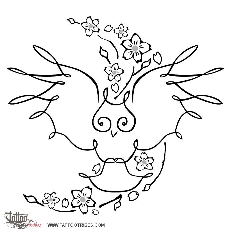 Owls, and barn owls, were respected by shamans on account of their ability to see through the deepest darkness, and called as guides for talking to spirits. Cherry blossoms symbolize the "carpe diem", living here and now, every moment, as if it was the most beautiful and the last. Having these two symbols together can be seen as understanding that the real life must be lived moment by moment, valuing everything.