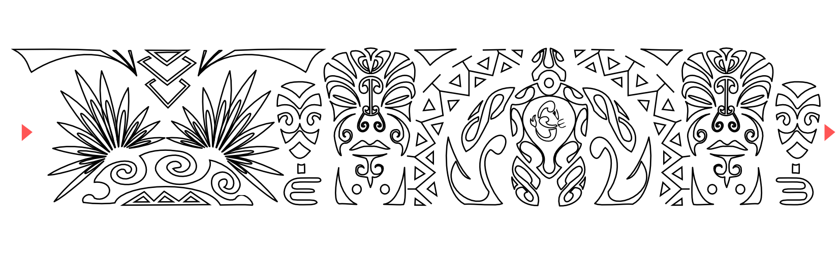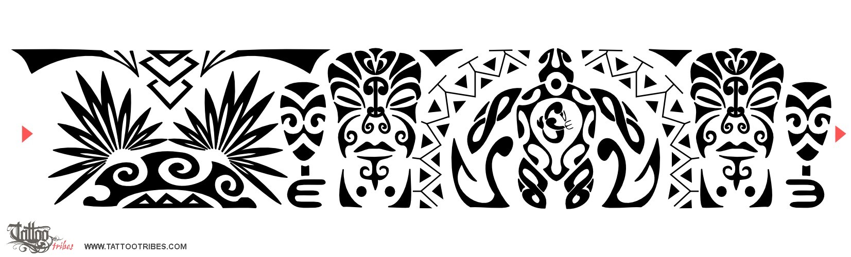 This Polynesian mixed style armband was requeste by Alfredo. The turtle in the middle, with twist-like fins, represents family and friends, and their importance (the sun); the warriors on both sides for protection have a mere in their hands, a short cub that now symbolizes facing difficulties and overcoming them. Fish hooks are for wealth and abundance upon earth (mountains, palms) an on the sea (waves). The manaia in the middle of the turtle´s shell is the guardian angel that protects family and friends. The stylized motif of the hammerhead shark.