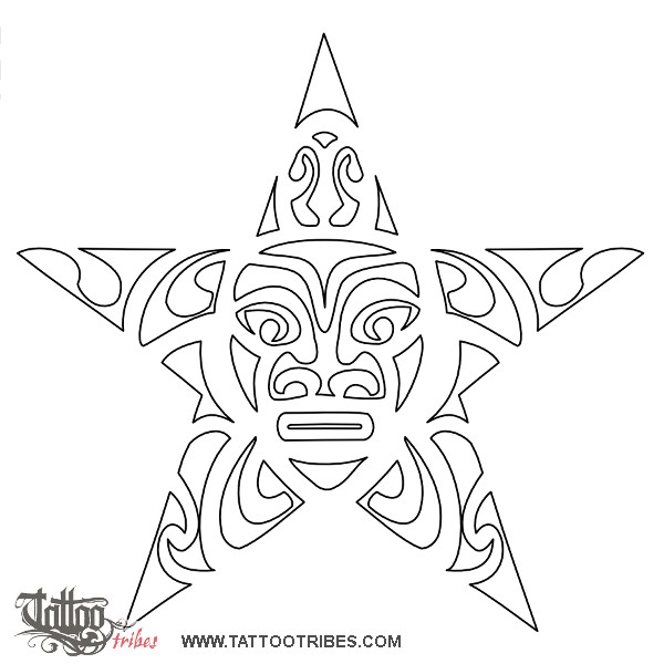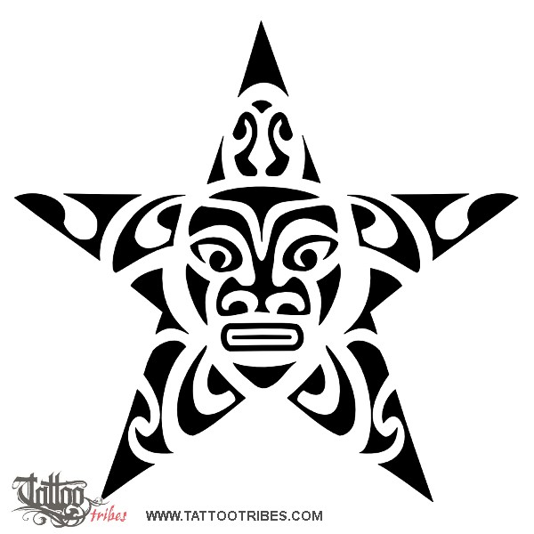 This Maori styled star includes a turtle on the inside, with the face of a tiki being the shell. The meanig of this design is family being the center (the star is the standing point always present, the goal to be reached, and the turtle symbolizes family); the tiki is a symbol of fertility and protection, and the stylized fish hooks on the upper points are symbols of abundance and wealth.