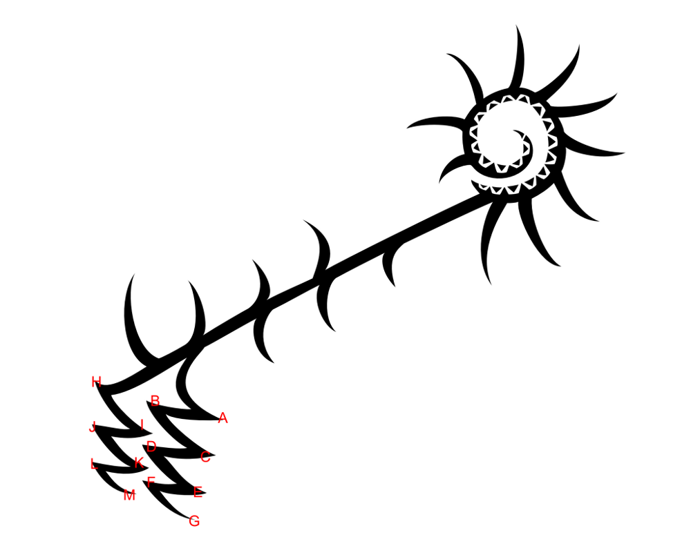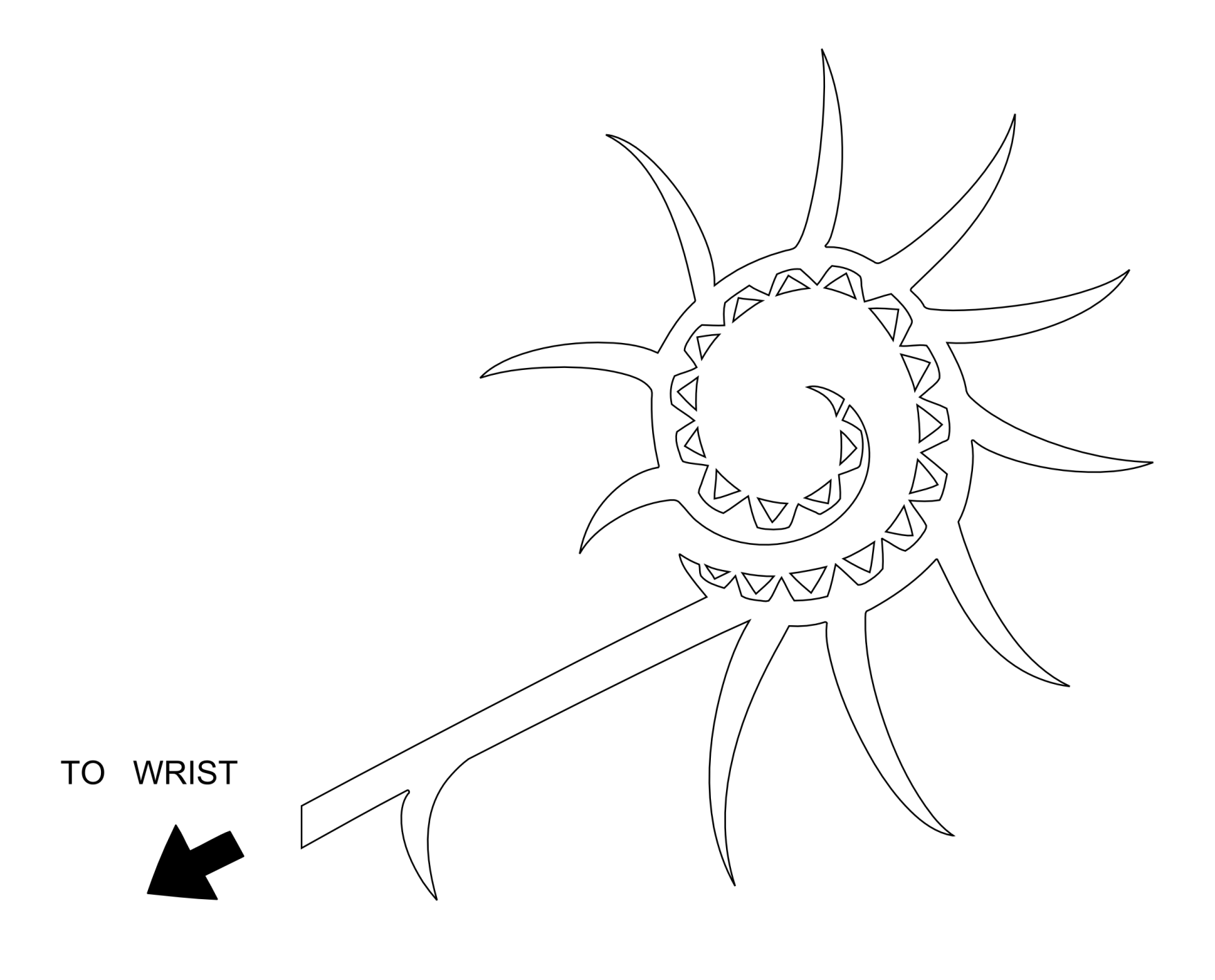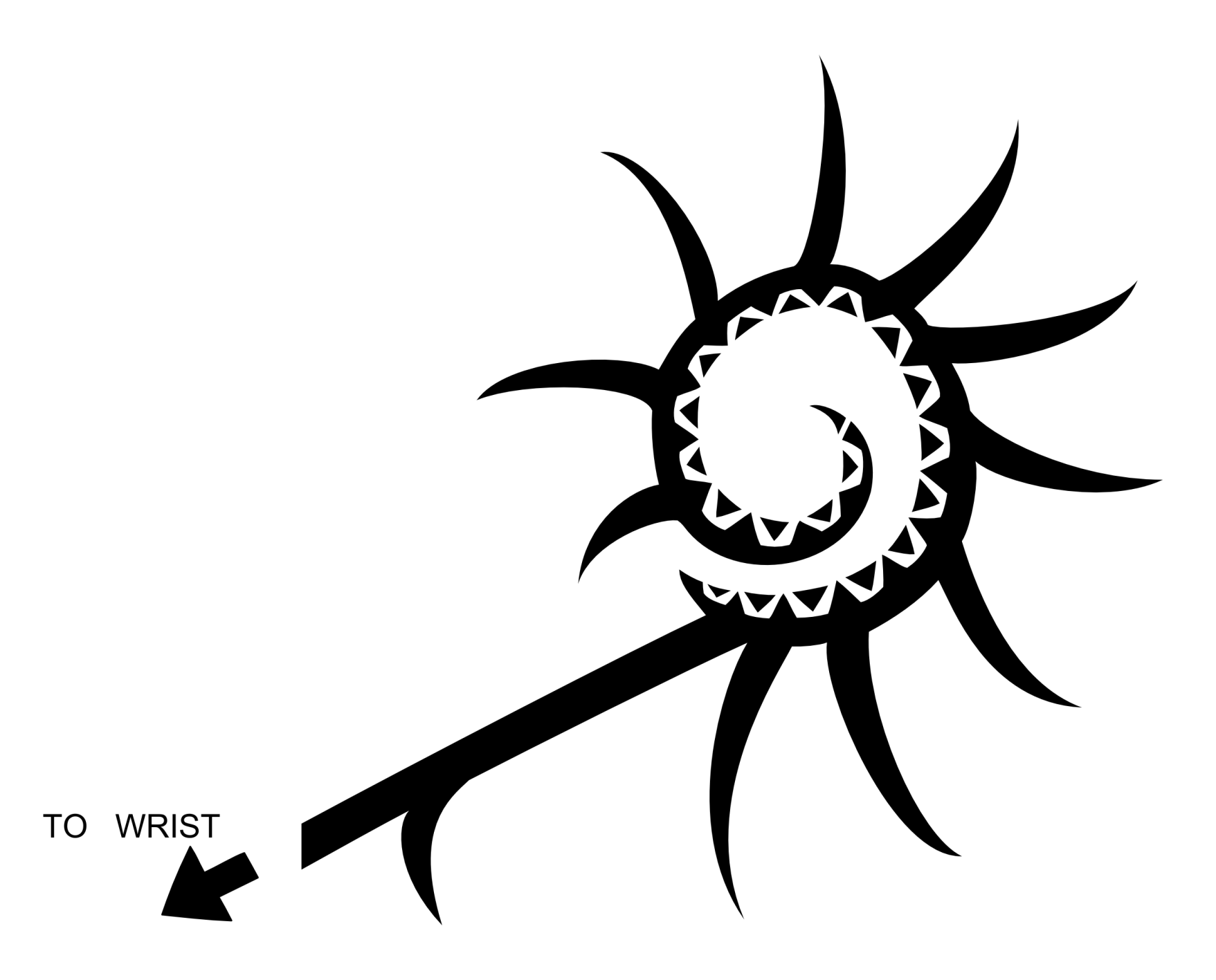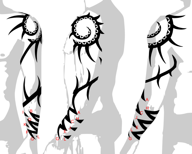 The attached image (1) shows how the finished tattoo looks like on the arm; image (2) show instead the full design. Both images have red letters to clearify how the flame patterns weave around the wrist.
