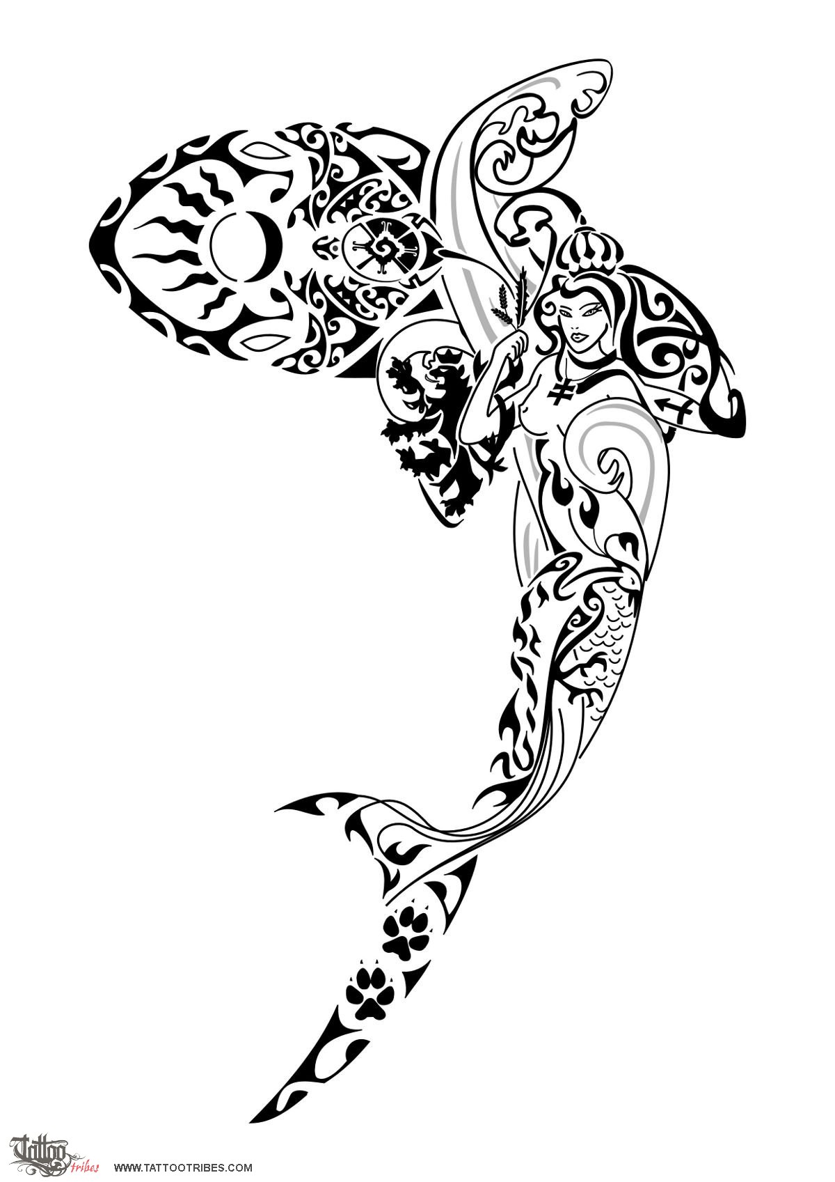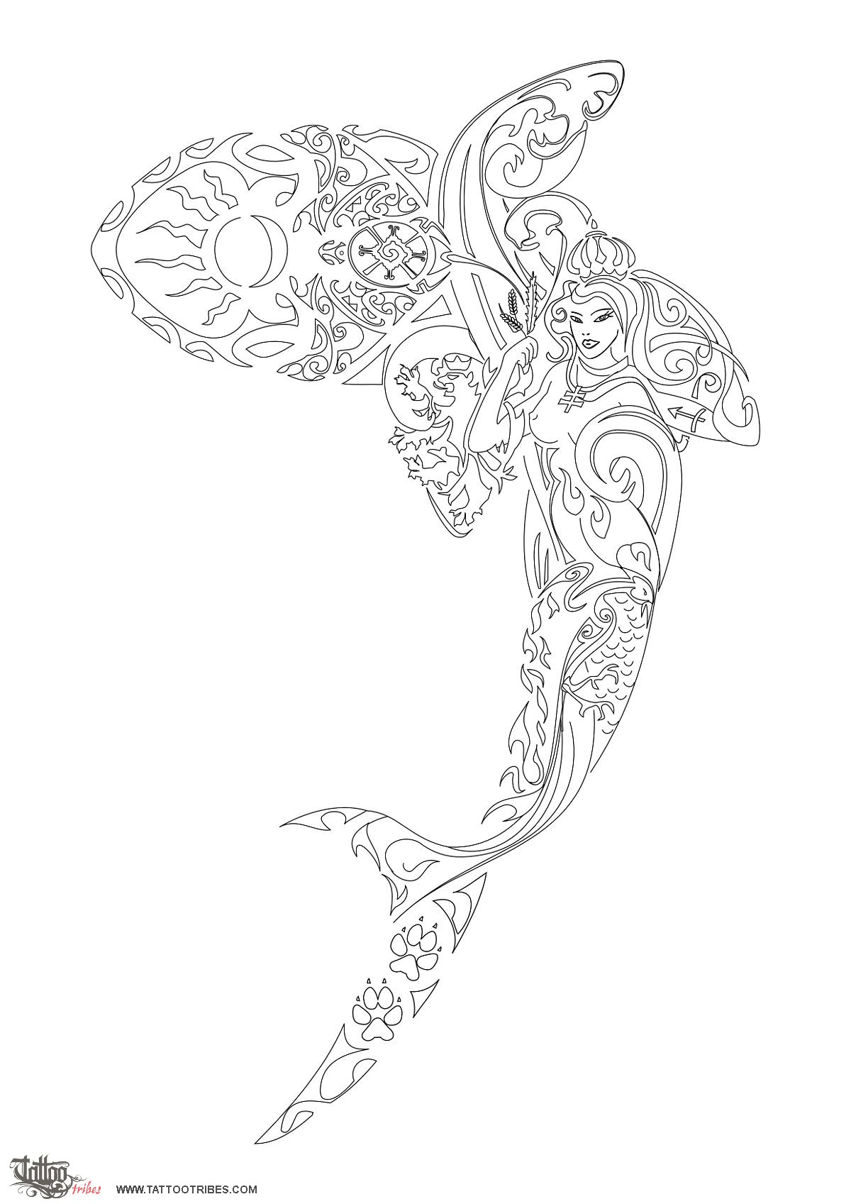 The shark tail itself is shared by the mermaid and partly made by the tail of a stylized phoenix (eternity and rebirth).