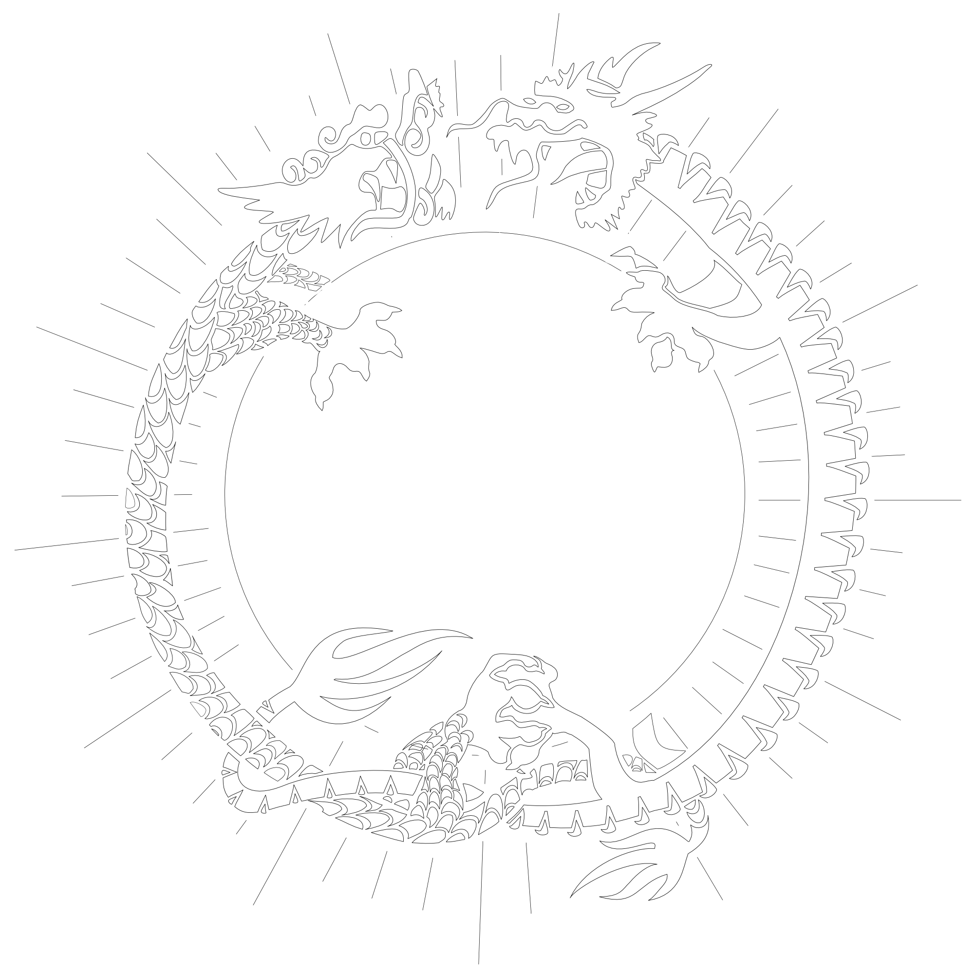 We were asked for a tattoo with a sun surrounded by two dragons weaving on the bottom and facing on the top. A possible interpretation to this can be "supremacy", as the two dragons, symbols of power, are fighting around the sun, symbol of glory and royalty.