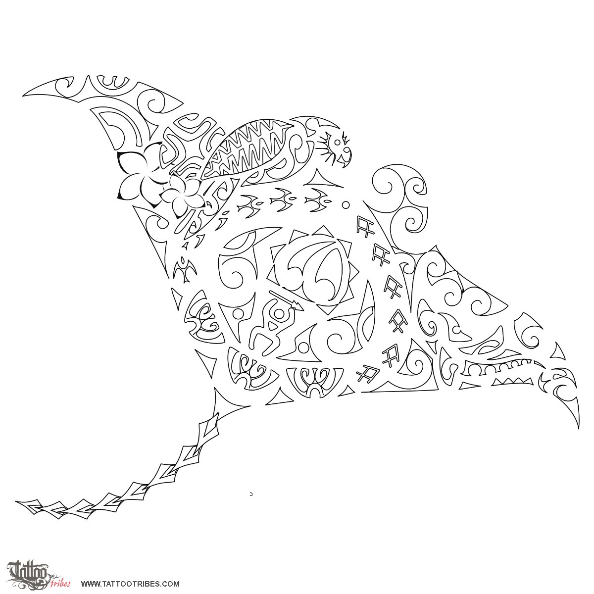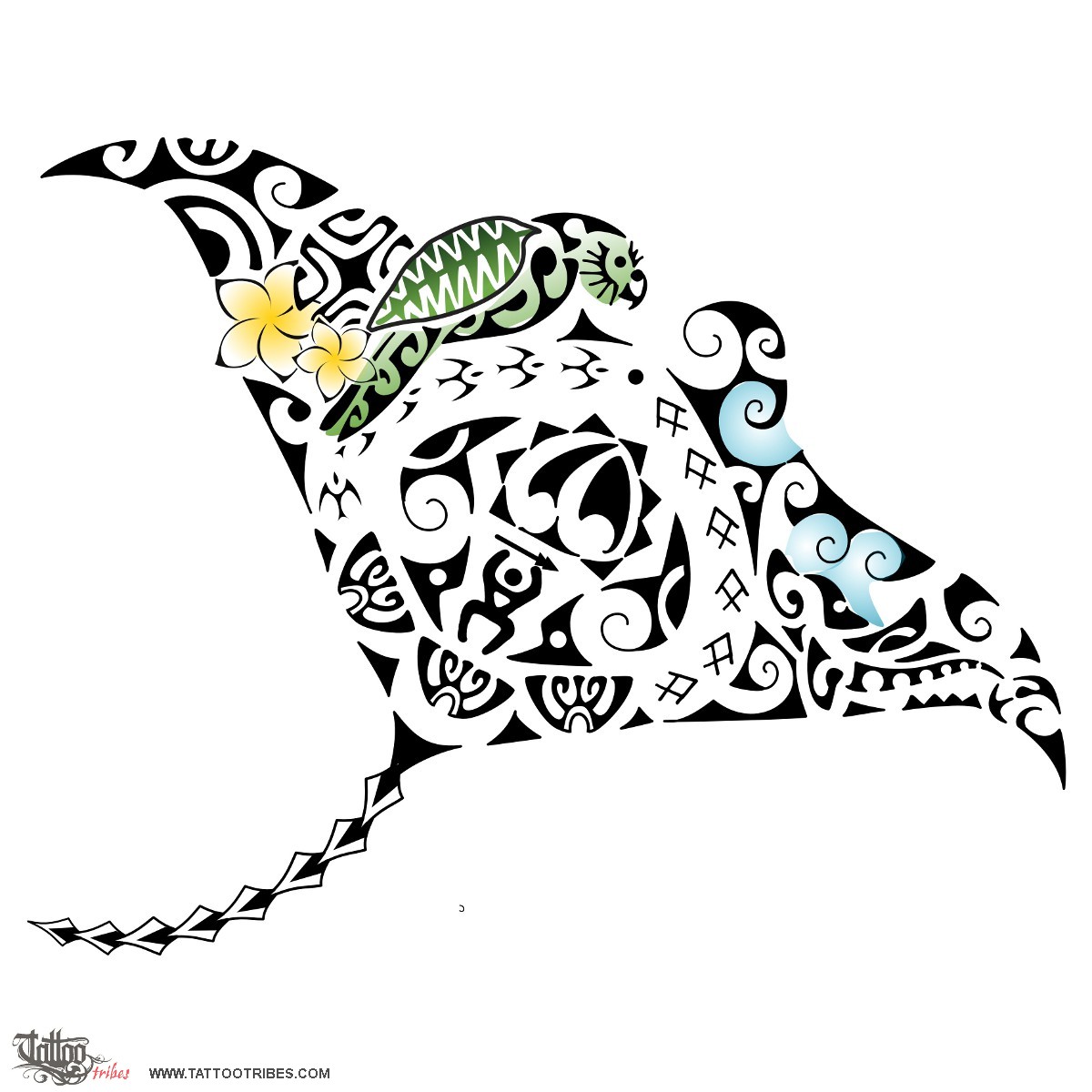 Inside the left wing of the manta we included some symbols showing her love for nature: the endangered kakapo parrot for the animal world, in green, next to a Marquesan cross representing balance and union of the elements, whereas two frangipani flowers representing beauty and shelter were added to symbolize the vegetal world.