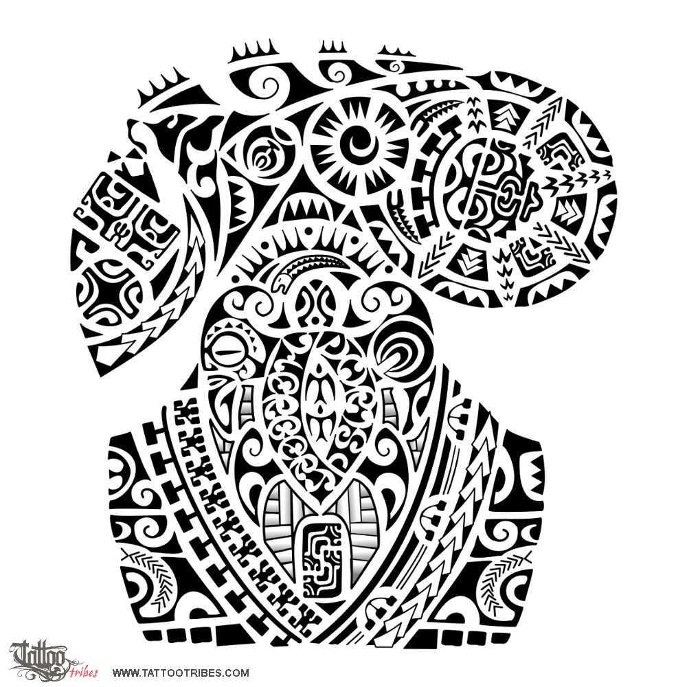 On the shoulder blade we stylized the head of his dog, to guard his back and protect him (the tiki below), with a fish for alertness and prosperity and an all-seeing eye to ward off any evil.