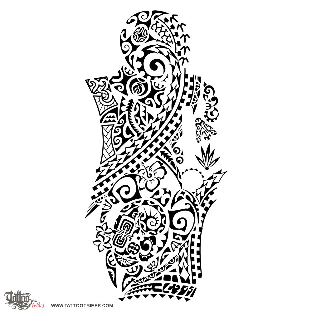 The turtle symbolizes the new family started by Tania, who requested this tattoo, and it´s surrounded by elements relating to her family of origin: a flower of hibiscus for her mother, a mere and an enata for her brothers, a frangipani for her and a bee for her father.