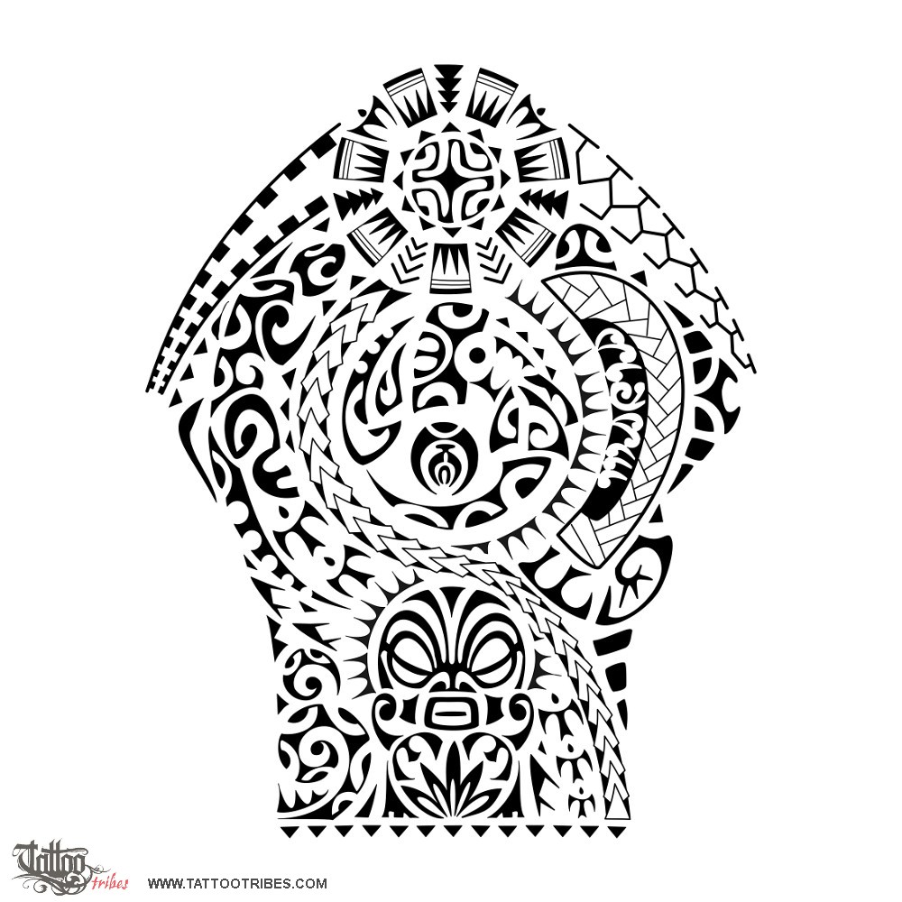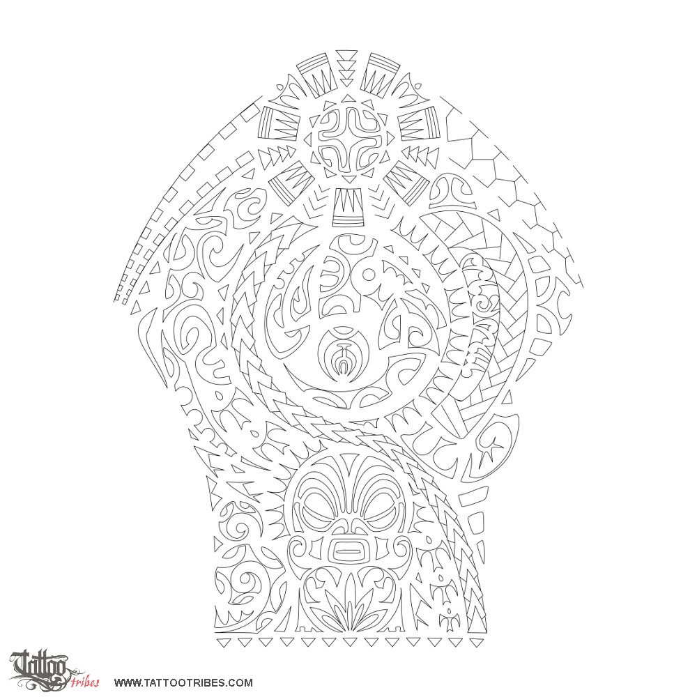The front flipper is a manta (freedom) while the back fins are a sea shell (intimacy, love and shelter) and a tiki hand (protection).
