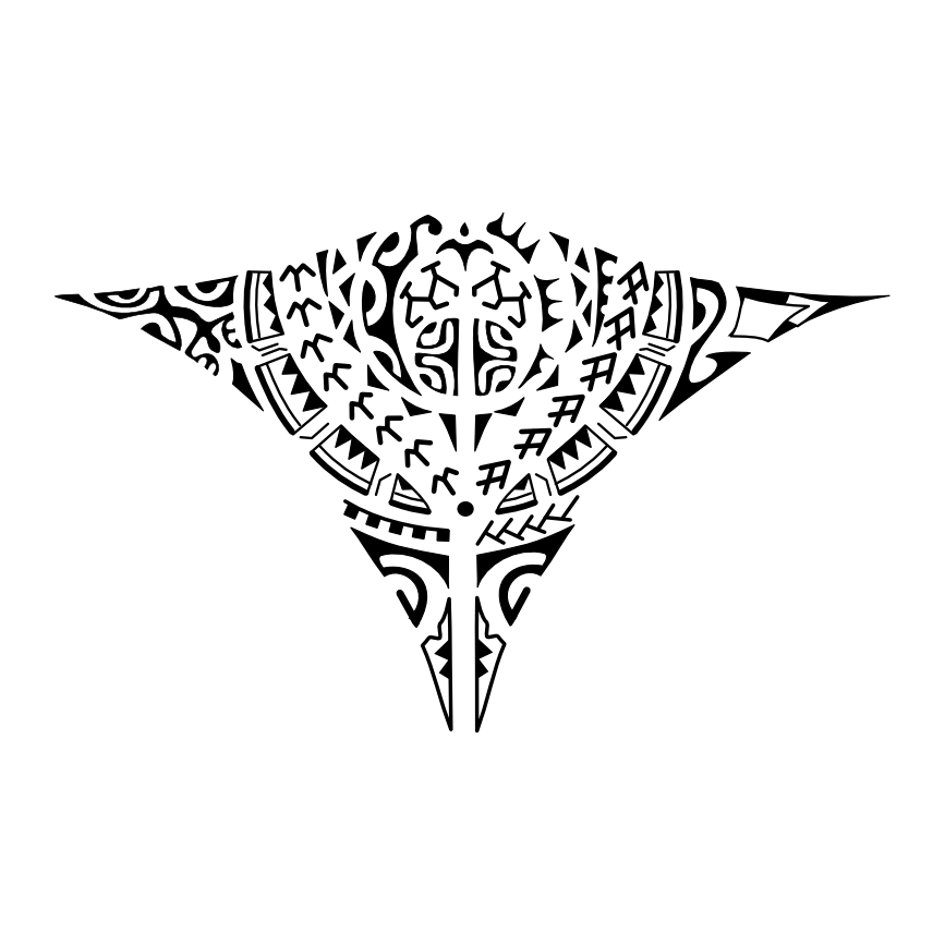 Inside the wings of the manta there are a lizard on the left for good luck and a fish hook with spear heads on the right for lessons learnt and the warrior fighting for what he believes in.