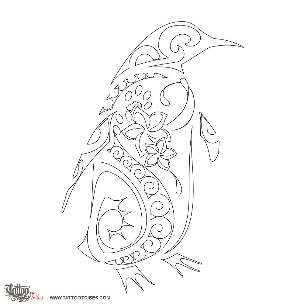 Hayley requested a penguin tattoo with several specific elements incorporated in it, like frangipani flowers and sea shells (femininity and love, safe shelter), waves (change) and dog paws.