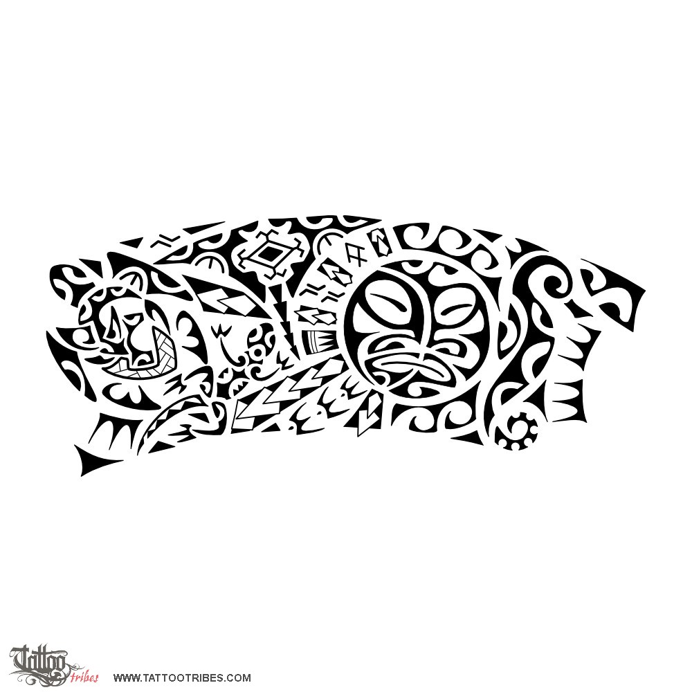 The turtle placed on the left of this band tattoo has a hammerhead shark on its shell to symbolize tenacity and determination protecting family.