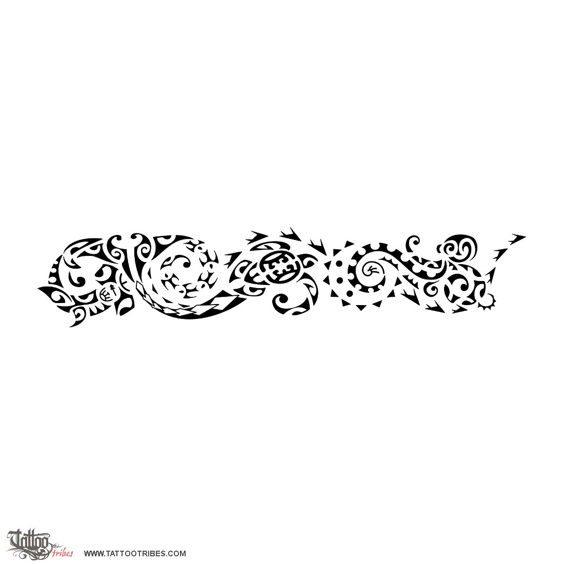 On the left of the turtle there are a manta (freedom, beauty and knowledge) protected by the spear heads and the hammerhead shark (tenacity and determination) that includes a warrior symbol.