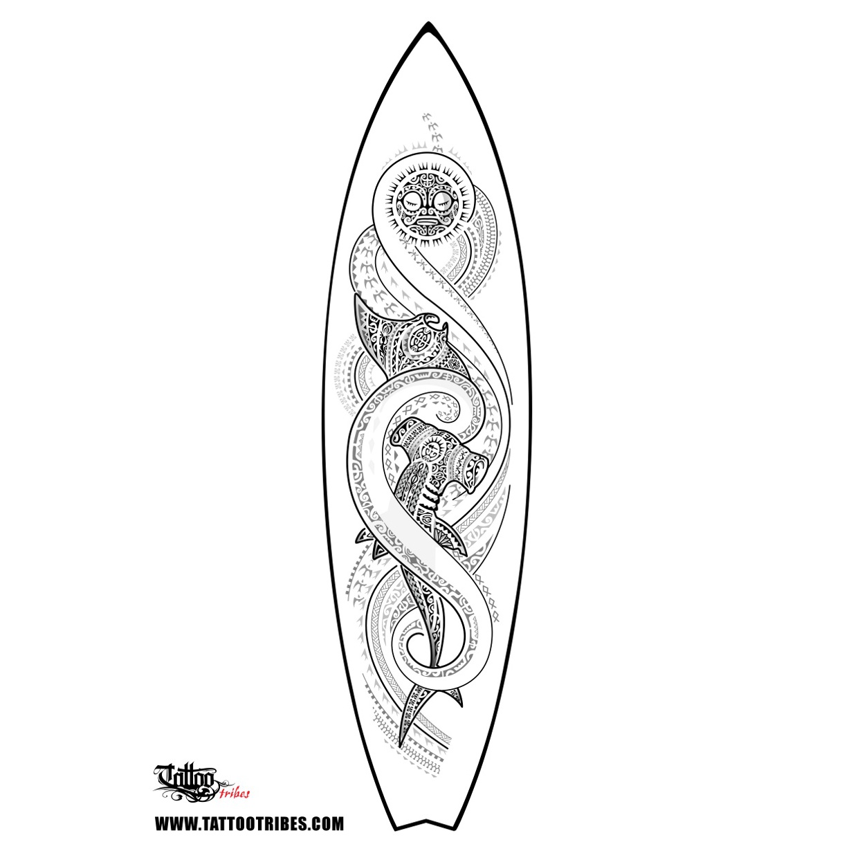This design was not prepared for a tattoo (the level of detail makes it impossible) but to decorate a surf board with Polynesian elements.