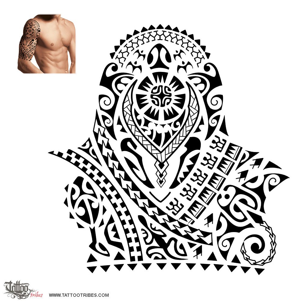 Polynesian tattoos explainedOn the shoulder of this half sleeve tattoo the turtle symbolizes the importance of family, which gives Amos balance and joy (the sun inside the shell with a Marquesan cross in the center).