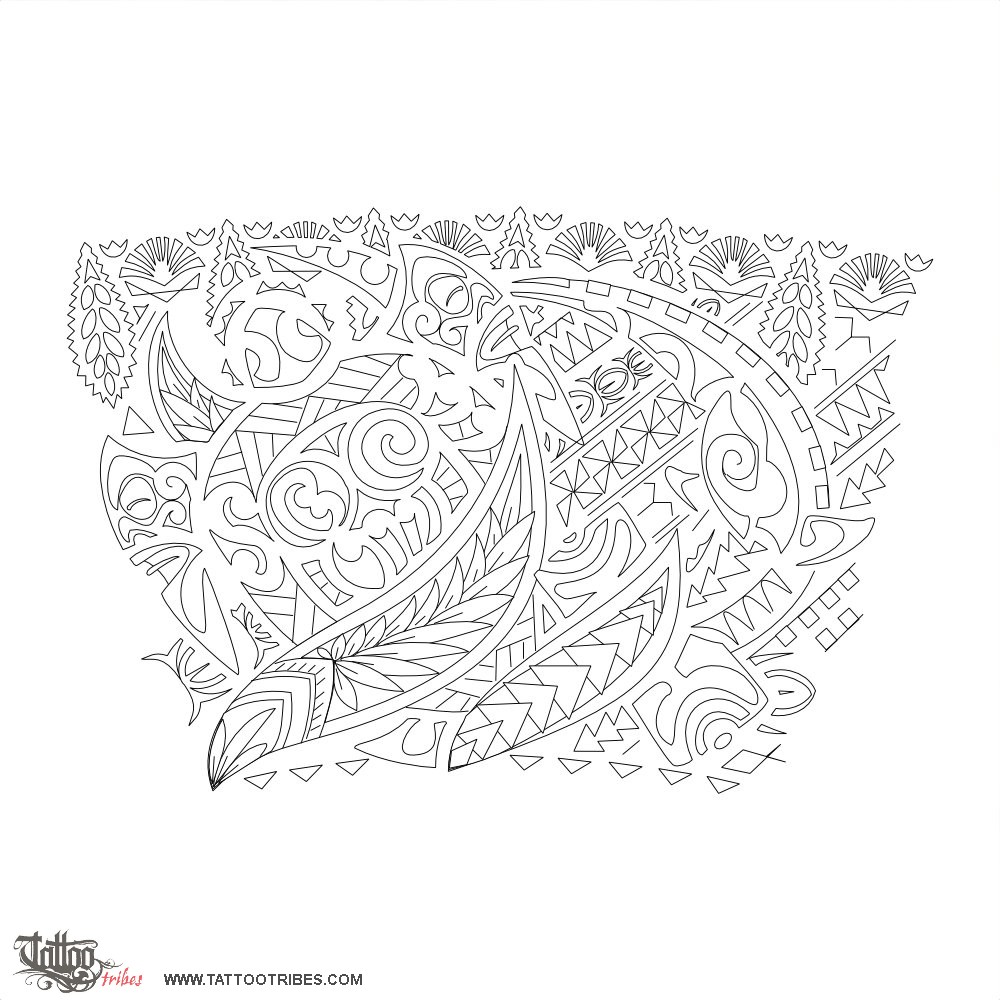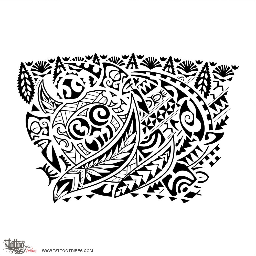 The main elements are a hammerhead shark and a turtle; the turtle is surrounded by flax leaves (family) and the shark has some spear heads overimposed (warrior).