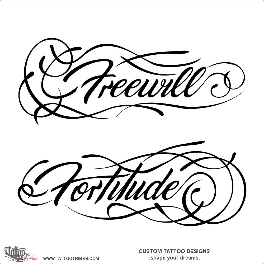 These two tattoos of the words Freewill and Fortitude decorated with spiraling motifs were prepared for Ritesh.