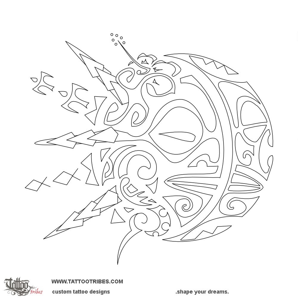 The sun and moon of this tattoo are made using two tiki for protection with the moon being a manta (freedom, harmony).