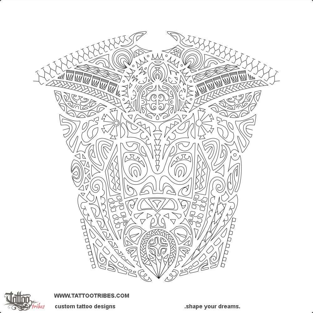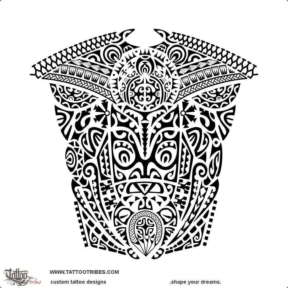 From top to bottom, the main elements included are a manta, with a stylized hawk face below it, a protector tiki and a turtle.