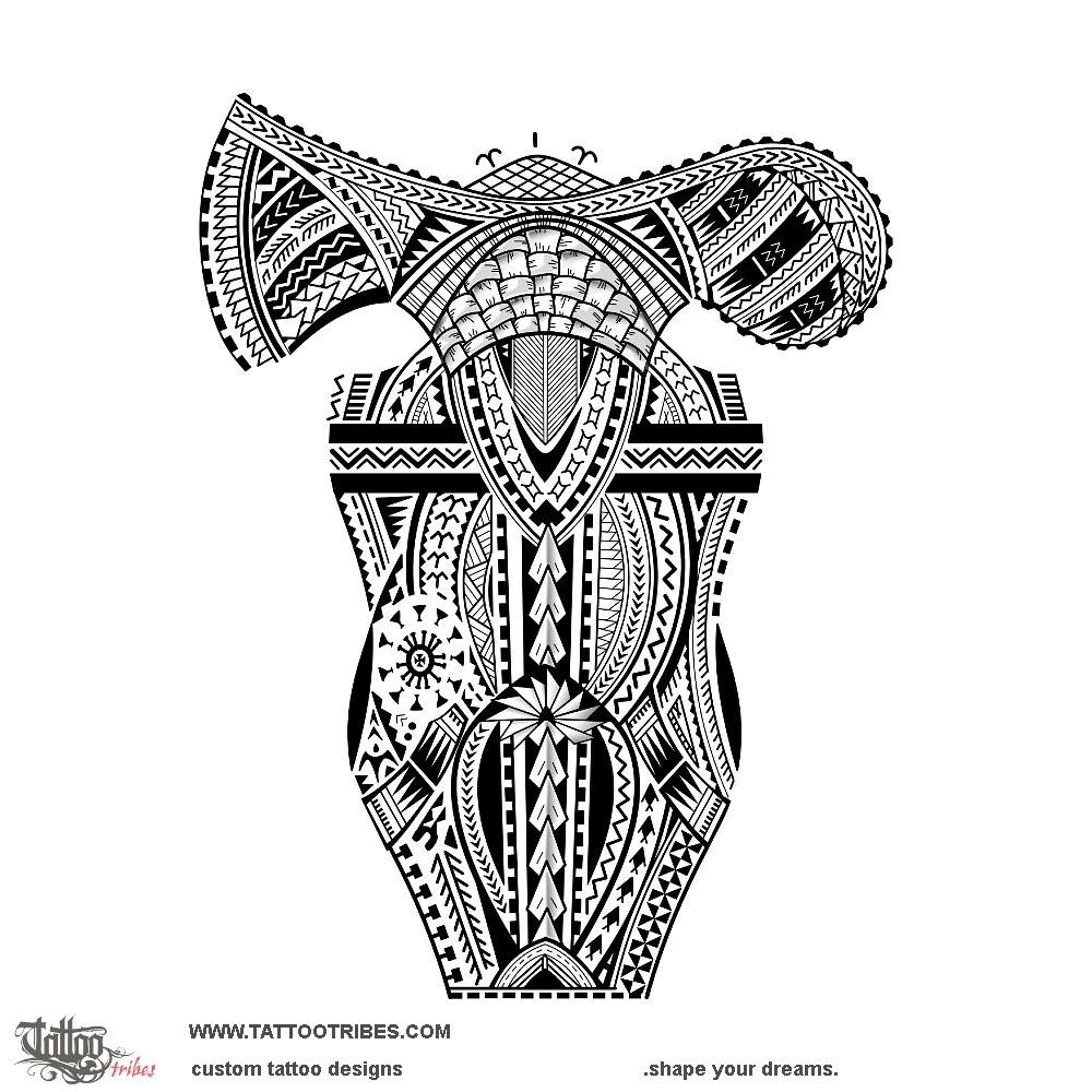 This full sleeve tattoo piece extending onto pec and shoulder blade was prepared for Peter and it includes elements reflecting his Samoan and Aimoré descent.