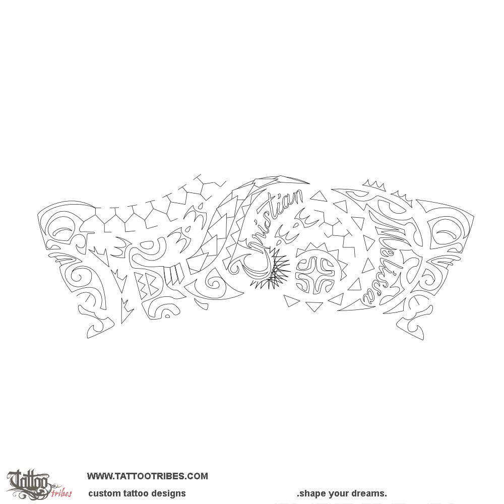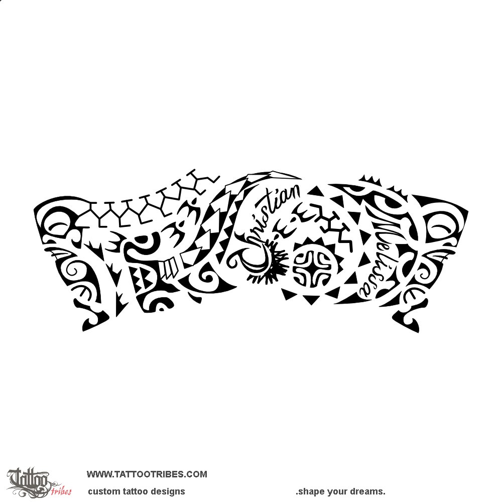 This Polynesian style band tattoo with irregular edges was prepared for Andrea and it incorporates the names of his two children inside of a sunmoon, with his son in the sun part and his daughter in the moon side.