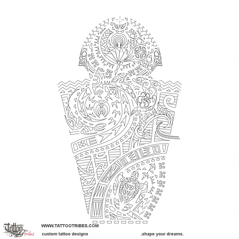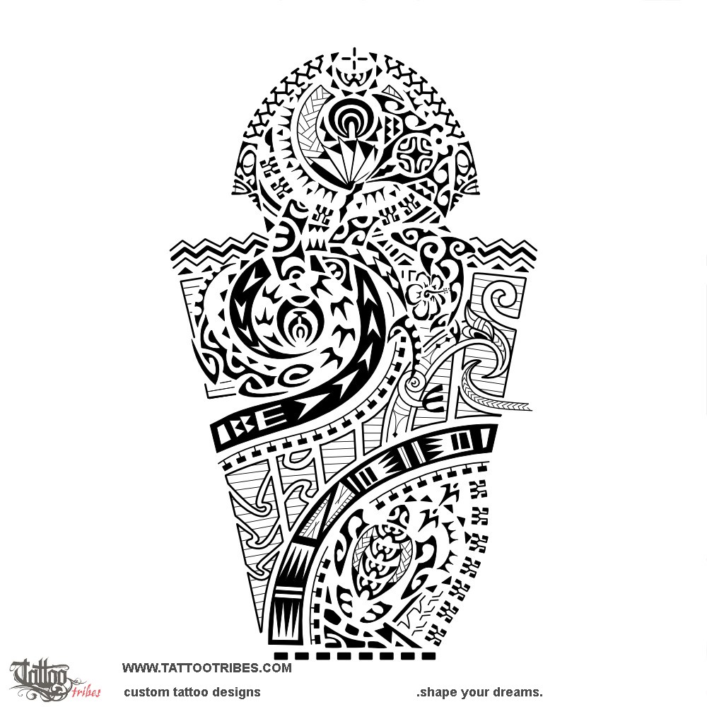 This full sleeve tattoo is mostly Tahitian in style, but it also includes elements from other Polynesian traditions: Samoan, Marquesan, Maori and Hawaiian, as requested by Erin, for whom it was prepared.
