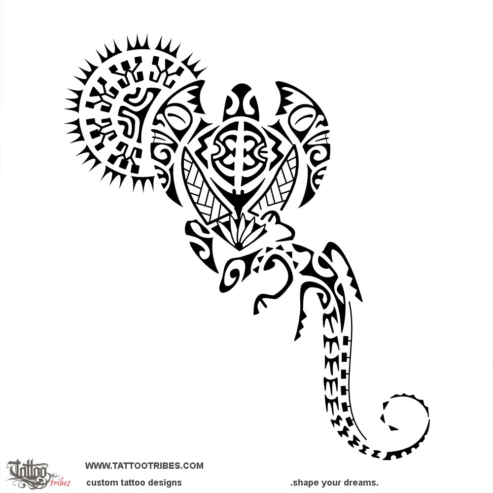 The turtle symbolizes family and long life, with the couple symbol in it to represent Wolfgang and his wife, a manta next to them to symbolizes passion and beauty, and braids and flax leaves for unity.